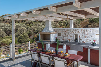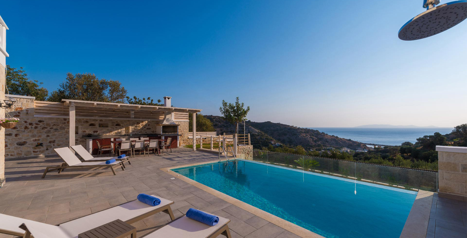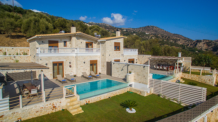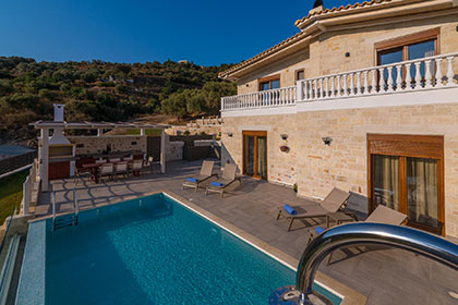 Castro Villas Crete are two independent fully equipped villas, featuring private swimming pools with built-in hydromassage. The newly built villas offer traditional design, merging concrete structural elements with stone. High quality equipment and comfortable furniture for up to six people each.