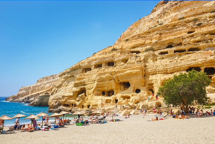 Palaiokastro is a seaside settlement located 14km west of the city of Heraklion. Its small beach, called Chelidoni, combines pebbles on the right side with sand on the left and remains unaffected by any northern winds in the area. The sea is calm without any waves, almost all year round.